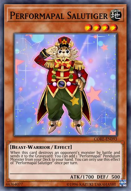 When this card destroys an opponent’s monster by battle and sends it to the Graveyard: You can add 1 “Performapal” Pendulum Monster from your Deck to your hand. You can only use this effect of “Performapal Salutiger” once per turn.