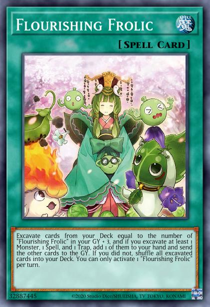 Excavate cards from your Deck equal to the number of “Flourishing Frolic” in your GY + 3, and if you excavate at least 1 Monster, 1 Spell, and 1 Trap, add 1 of them to your hand and send the other cards to the GY. If you did not, shuffle all excavated cards into your Deck. You can only activate 1 “Flourishing Frolic” per turn.