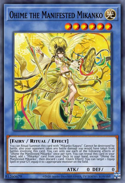 You can Ritual Summon this card with “Mikanko Kagura”. Cannot be destroyed by battle, also your opponent takes any battle damage you would have taken from battles involving this card. You can only use each of the following effects of “Ohime the Manifested Mikanko” once per turn. You can reveal this card in your hand; add 1 “Mikanko” card from your Deck to your hand, except “Ohime the Manifested Mikanko”, then discard 1 card. (Quick Effect): You can target 1 Equip Spell in your GY; equip it to 1 appropriate monster on the field.
