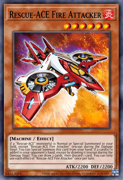 If a “Rescue-ACE” monster(s) is Normal or Special Summoned to your field, except “Rescue-ACE Fire Attacker” (except during the Damage Step): You can Special Summon this card from your hand. If a card(s) is added to your opponent’s hand, except by drawing it (except during the Damage Step): You can draw 2 cards, then discard 1 card. You can only use each effect of “Rescue-ACE Fire Attacker” once per turn.