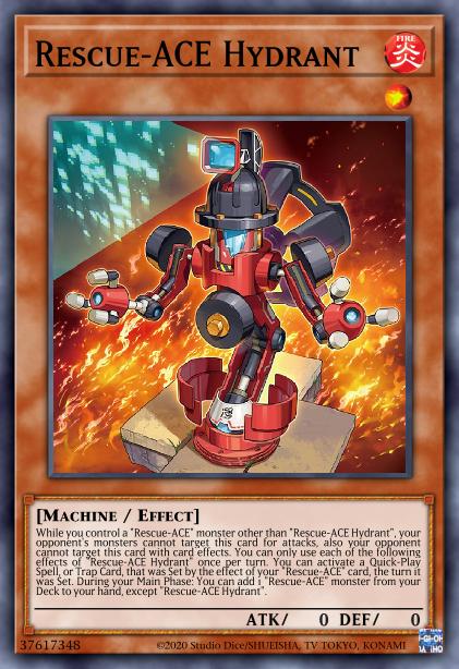 While you control a “Rescue-ACE” monster other than “Rescue-ACE Hydrant”, your opponent’s monsters cannot target this card for attacks, also your opponent cannot target this card with card effects. You can only use each of the following effects of “Rescue-ACE Hydrant” once per turn. You can activate a Quick-Play Spell, or Trap Card, that was Set by the effect of your “Rescue-ACE” card, the turn it was Set. During your Main Phase: You can add 1 “Rescue-ACE” monster from your Deck to your hand, except “Rescue-ACE Hydrant”.
