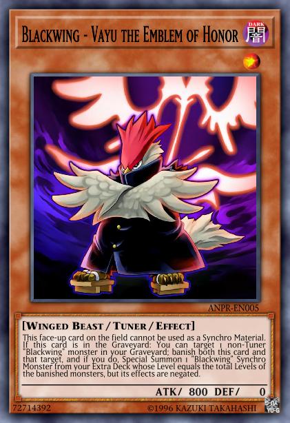This face-up card on the field cannot be used as a Synchro Material. If this card is in the Graveyard: You can target 1 non-Tuner “Blackwing” monster in your Graveyard; banish both this card and that target, and if you do, Special Summon 1 “Blackwing” Synchro Monster from your Extra Deck whose Level equals the total Levels of the banished monsters, but its effects are negated.