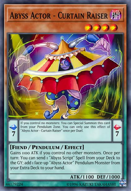 If you control no monsters: You can Special Summon this card from your Pendulum Zone. You can only use this effect of “Abyss Actor – Curtain Raiser” once per Duel.r