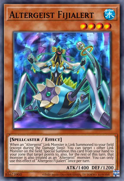 When an “Altergeist” Link Monster is Link Summoned to your field (except during the Damage Step): You can target 1 other Link Monster on the field; Special Summon this card from your hand to your zone that target points to, also, for the rest of this turn, that monster is also treated as an “Altergeist” monster. You can only use this effect of “Altergeist Fijialert” once per turn.