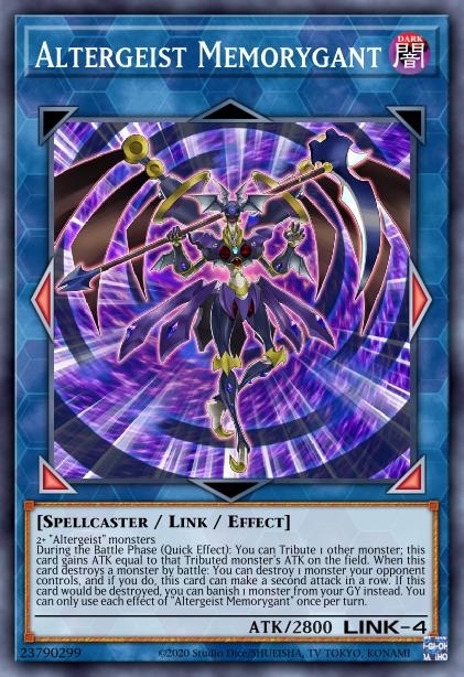 During the Battle Phase (Quick Effect): You can Tribute 1 other monster; this card gains ATK equal to that Tributed monster’s ATK on the field. When this card destroys a monster by battle: You can destroy 1 monster your opponent controls, and if you do, this card can make a second attack in a row. If this card would be destroyed, you can banish 1 monster from your GY instead. You can only use each effect of “Altergeist Memorygant” once per turn.