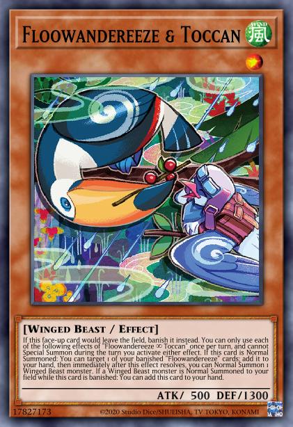 If this face-up card would leave the field, banish it instead. You can only use each of the following effects of “Floowandereeze & Toccan” once per turn, and cannot Special Summon during the turn you activate either effect. If this card is Normal Summoned: You can target 1 of your banished “Floowandereeze” cards; add it to your hand, then immediately after this effect resolves, you can Normal Summon 1 Winged Beast monster. If a Winged Beast monster is Normal Summoned to your field while this card is banished: You can add this card to your hand.