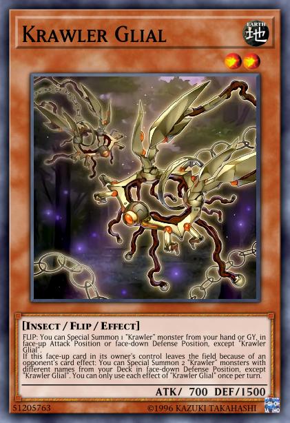 If this face-up card in its owner’s control leaves the field because of an opponent’s card effect: You can Special Summon 2 “Krawler” monsters with different names from your Deck in face-down Defense Position, except “Krawler Glial”. You can only use each effect of “Krawler Glial” once per turn.