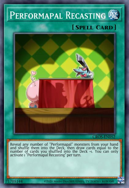 Reveal any number of “Performapal” monsters from your hand and shuffle them into the Deck, then draw cards equal to the number of cards you shuffled into the Deck +1. You can only activate 1 “Performapal Recasting” per turn.