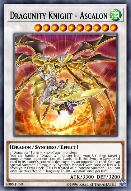 You can banish 1 “Dragunity” monster from your GY, then target 1 monster your opponent controls; banish it. If this Synchro Summoned card in its owner’s control is destroyed by an opponent’s card: You can Special Summon 1 “Dragunity” Synchro Monster with 3000 or less ATK from your Extra Deck. (This is treated as a Synchro Summon.) You can only use this effect of “Dragunity Knight – Ascalon” once per turn.