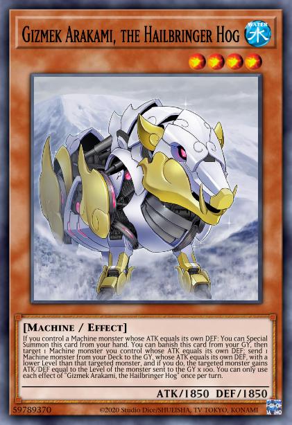 If you control a Machine monster whose ATK equals its own DEF: You can Special Summon this card from your hand. You can banish this card from your GY, then target 1 Machine monster you control whose ATK equals its own DEF; send 1 Machine monster from your Deck to the GY, whose ATK equals its own DEF, with a lower Level than that targeted monster, and if you do, the targeted monster gains ATK/DEF equal to the Level of the monster sent to the GY x 100. You can only use each effect of “Gizmek Arakami, the Hailbringer Hog” once per turn.