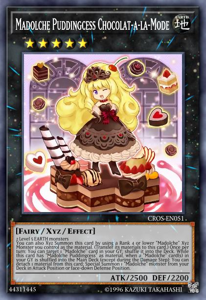 You can also Xyz Summon this card by using a Rank 4 or lower “Madolche” Xyz Monster you control as the material. (Transfer its materials to this card.) Once per turn: You can target 1 “Madolche” card in your GY; shuffle it into the Deck. While this card has “Madolche Puddingcess” as material, when a “Madolche” card(s) in your GY is shuffled into the Main Deck (except during the Damage Step): You can detach 1 material from this card; Special Summon 1 “Madolche” monster from your Deck in Attack Position or face-down Defense Position.