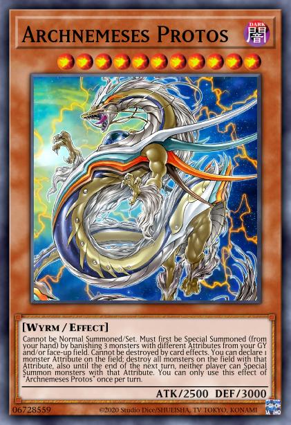 Cannot be Normal Summoned/Set. Must first be Special Summoned (from your hand) by banishing 3 monsters with different Attributes from your GY and/or face-up field. Cannot be destroyed by card effects. You can declare 1 monster Attribute on the field; destroy all monsters on the field with that Attribute, also until the end of the next turn, neither player can Special Summon monsters with that Attribute. You can only use this effect of “Archnemeses Protos” once per turn.