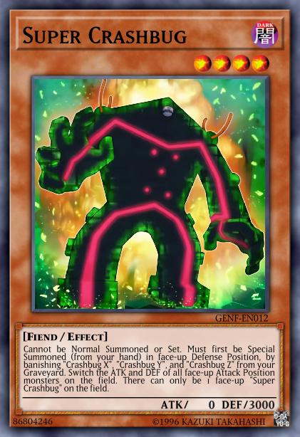 Cannot be Normal Summoned or Set. Must first be Special Summoned (from your hand) in face-up Defense Position, by banishing “Crashbug X”, “Crashbug Y”, and “Crashbug Z” from your Graveyard. Switch the ATK and DEF of all face-up Attack Position monsters on the field. There can only be 1 face-up “Super Crashbug” on the field.