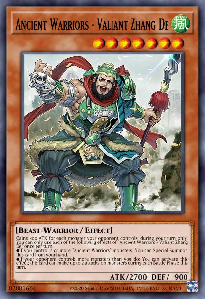 Gains 300 ATK for each monster your opponent controls, during your turn only. You can only use each of the following effects of “Ancient Warriors – Valiant Zhang De” once per turn.r