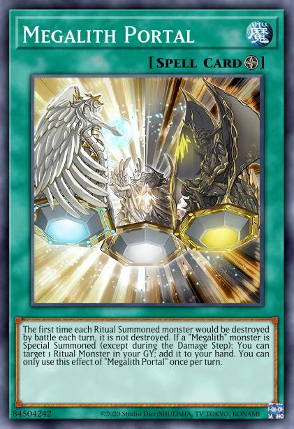 The first time each Ritual Summoned monster would be destroyed by battle each turn, it is not destroyed. If a “Megalith” monster is Special Summoned (except during the Damage Step): You can target 1 Ritual Monster in your GY; add it to your hand. You can only use this effect of “Megalith Portal” once per turn.