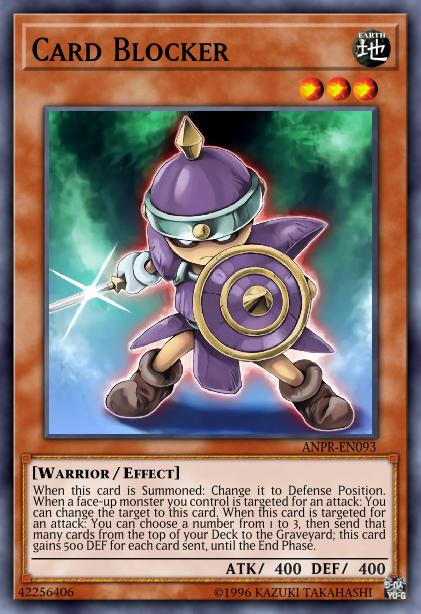 When this card is Summoned: Change it to Defense Position. When a face-up monster you control is targeted for an attack: You can change the target to this card. When this card is targeted for an attack: You can choose a number from 1 to 3, then send that many cards from the top of your Deck to the Graveyard; this card gains 500 DEF for each card sent, until the End Phase.