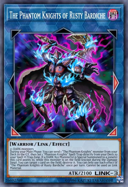 During your Main Phase: You can send 1 “The Phantom Knights” monster from your Deck to the GY, then Set 1 “Phantom Knights” Spell/Trap directly from your Deck to your Spell & Trap Zone. If a DARK Xyz Monster(s) is Special Summoned to a zone(s) this card points to, while this monster is on the field (except during the Damage Step): You can target 1 card on the field; destroy it. You can only use each effect of “The Phantom Knights of Rusty Bardiche” once per turn. Cannot be used as Link Material.