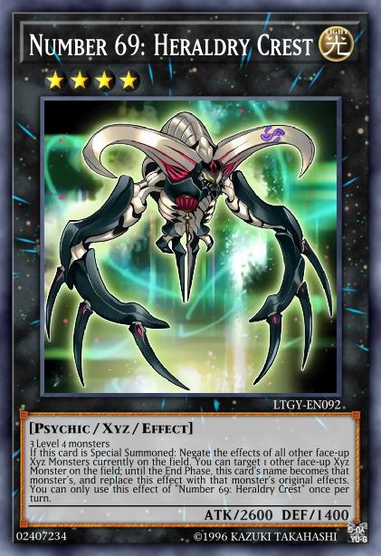 When this card is Special Summoned: Negate the effects of all other face-up Xyz Monsters currently on the field. You can target 1 other face-up Xyz Monster on the field; until the End Phase, this card’s name and original effect become the same as that monster. You can only use this effect of “Number 69: Heraldry Crest” once per turn.