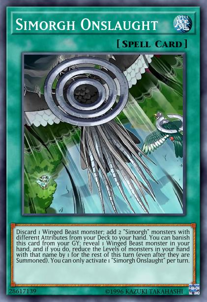 Discard 1 Winged Beast monster; add 2 “Simorgh” monsters with different Attributes from your Deck to your hand. You can banish this card from your GY; reveal 1 Winged Beast monster in your hand, and if you do, reduce the Levels of monsters in your hand with that name by 1 for the rest of this turn (even after they are Summoned). You can only activate 1 “Simorgh Onslaught” per turn.