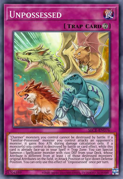 “Charmer” monsters you control cannot be destroyed by battle. If a “Familiar-Possessed” monster you control attacks an opponent’s monster, it gains 800 ATK during damage calculation only. If a monster(s) you control is destroyed by battle or card effect: You can Special Summon 1 Spellcaster-Type monster with 1500 DEF from your Deck, whose Attribute is different from at least 1 of those destroyed monsters’ original Attributes on the field, in Attack Position or face-down Defense Position. You can only use this effect of “Unpossessed” once per turn.