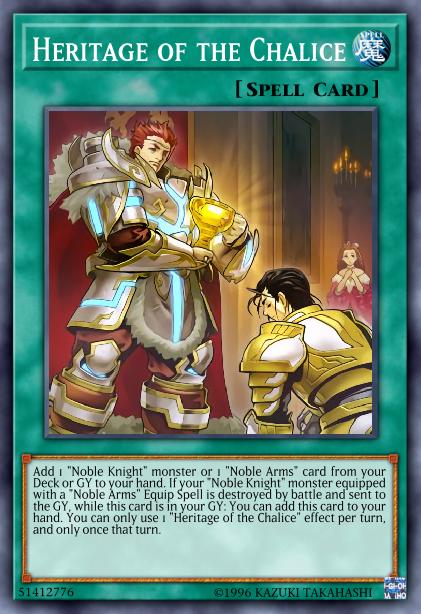 Add 1 “Noble Knight” monster or 1 “Noble Arms” card from your Deck or GY to your hand. If your “Noble Knight” monster equipped with a “Noble Arms” Equip Spell is destroyed by battle and sent to the GY, while this card is in your GY: You can add this card to your hand. You can only use 1 “Heritage of the Chalice” effect per turn, and only once that turn.