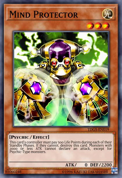 This card’s controller must pay 500 Life Points during each of their Standby Phases. If they cannot, destroy this card. Monsters with 2000 or less ATK cannot declare an attack, except for Psychic-Type monsters.